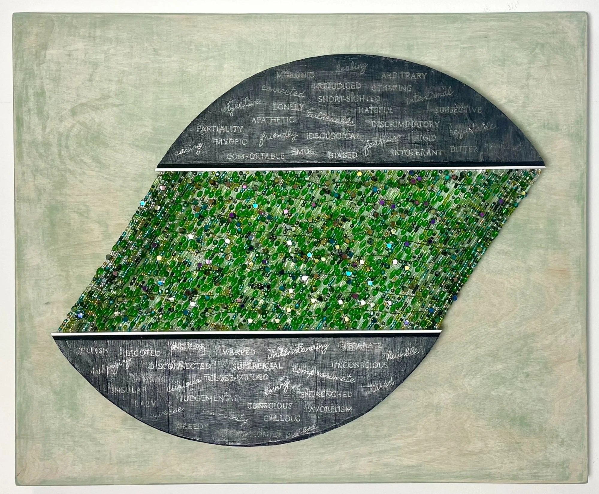media: wood, metal, glass beads, twine, acrylic paint, neoprene